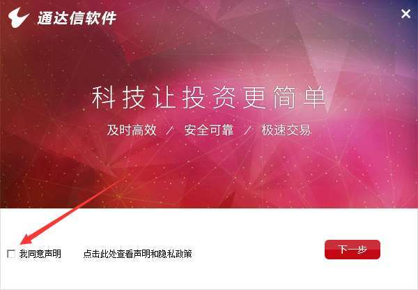 1、在PK游戏网下载通达信金融终端电脑版的压缩包,解压后,双击exe文件,进入安装界面,勾选我同意声明,点击下一步