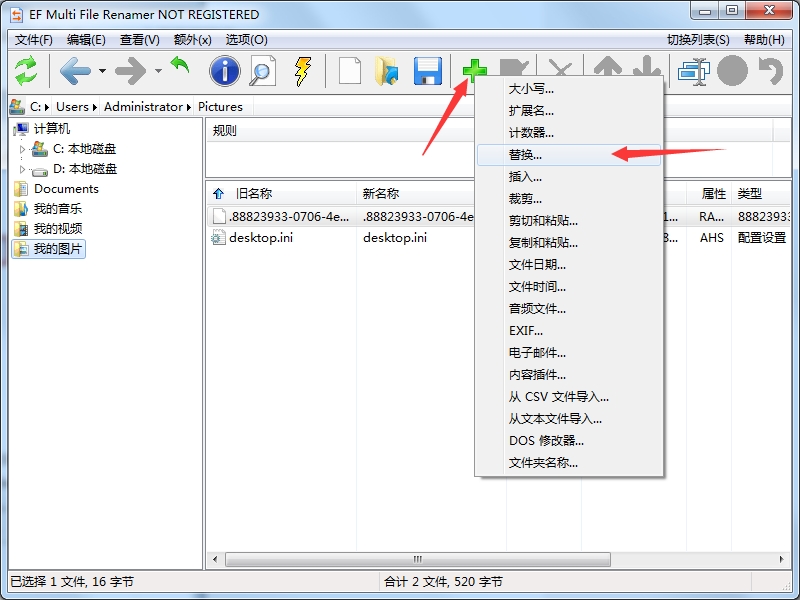 这里想要对我的图片中文件进行重命名。首先我们要添加文件命名规则。点击EF Multi File Renamer主界面顶部工具栏中的规则添加按钮,展开文件名改名规则列表。选择替换;