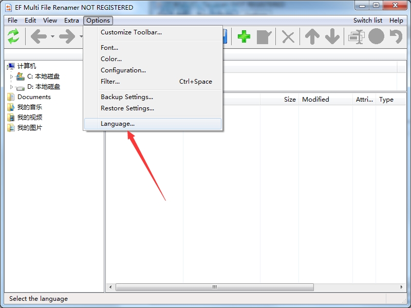 打开EF Multi File Renamer后软件的主界面是英文,软件支持中文显示,我们首先将软件显示语言设置成中文。点击EF Multi File Renamer主界面顶部菜单栏中的options,打开选项菜单。点击菜单中的language语言,打开语言设置窗口;
