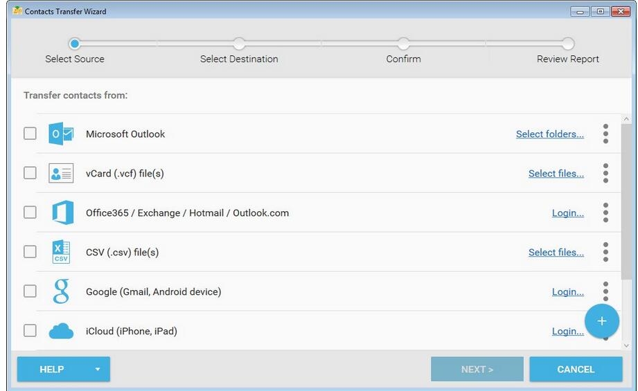 从多个设备和来源转移联系人:Android手机,Gmail通讯录,Google通讯录。