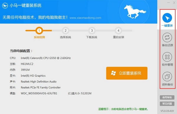 小马一键重装系统主要有四个功能模块,分布在界面右侧:一键重装、备份还原、软件管理、资料备份。