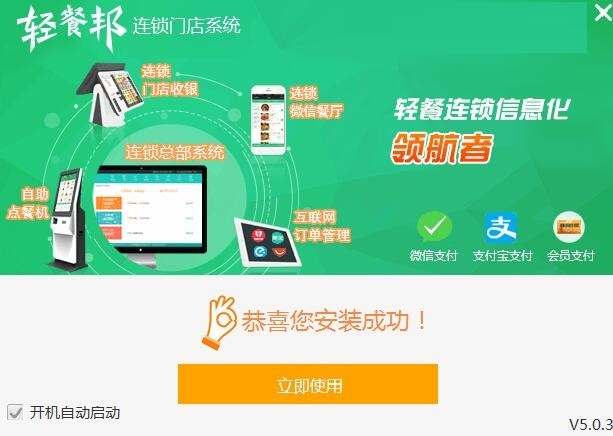 3、显示轻餐邦连锁门店系统安装完毕,现在就可以立即使用