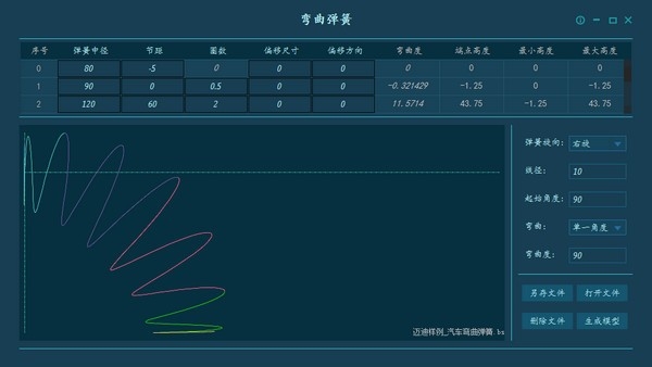 弯曲弹簧工具最新版最新版是款针对弹簧所打造的三维设计工具。弯曲弹簧工具官方版可用于解决异形弹簧绘制,快速设置螺旋曲线变径、变螺距、弯曲度等相关参数。弯曲弹簧工具可轻松控制螺旋曲线的变径、变螺距、正负螺距、带角度偏移、弯曲度等参数,典型应用于汽车减震弯曲弹簧的三维设计,此工具中自带的弹簧参数文件,不注册即可生成。
