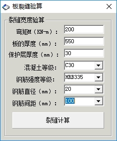 2、板裂缝计算:钢筋间距、钢筋直径、钢筋强度等级、混凝土等级、保护层厚度、板的厚度、弯矩