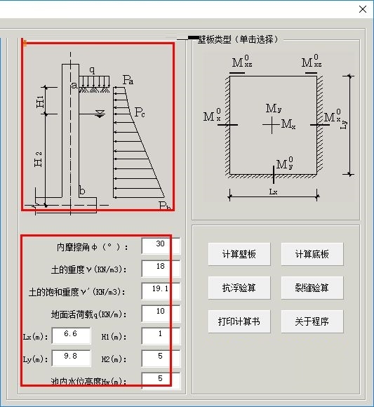 水池构件计算官方版是款适用于工程师们所打造的计算工具。水池构件计算电脑版可以自定义选择四边的连接形式,输入一些基本的参数,主要有内摩擦角,土的重度,土的饱和重度,地面活荷载等即可。水池构件计算中用户只要根据自己测量的数据,将数值输入软件上,就可以得到结果,并且提供一个图形的参考方案,可以根据与图形展示的公式自己计算。