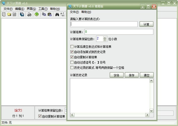 天下计算器最新版是一款十分优秀的计算工具,天下计算器最新版界面简洁,功能强大,支持多行表达式,也支持[全文]和[选择]计算方式,计算更为灵活。不仅如此,天下计算器官方版还支持文件拖动读取,支持自动文件关联,自动存取软件配置信息等操作,可以帮助大家进行更好的操作。