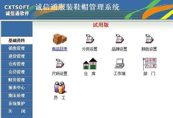 诚信通服装鞋帽进销存官方版是一款服装鞋帽进销存管理软件。诚信通服装鞋帽进销存官方版包含了尺码设置、员工管理、工作端、部门管理、销售开单、销售退货、进货开单、进货退货、仓库管理、会员管理、财务管理以及报表中心等主要功能。诚信通服装鞋帽进销存可以随时备份系统中的数据。