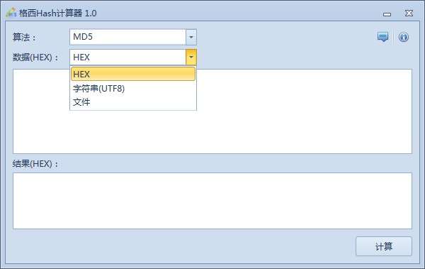 2、计算的数据源可以是HEX数据字符串、字符串(UTF8,即计算时将字符串转为UTF8格式进行计算)以及文件。