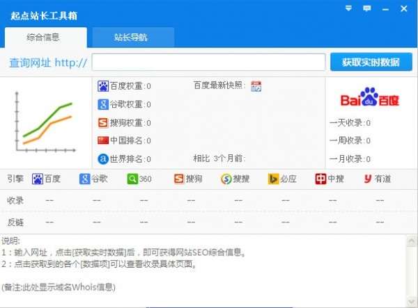 起点站长工具箱官方版是一款实用的用.Net制作的站点综合信息查询工具。起点站长工具箱最新版主要功能是查询某个站点的Google Pagerank、Alexa世界排名、Sogou指数、中国网站排名,以及在几大主要搜索引擎中的收录反向链接的情况。起点站长工具箱官方版使用方便,打开工具就可以查询。