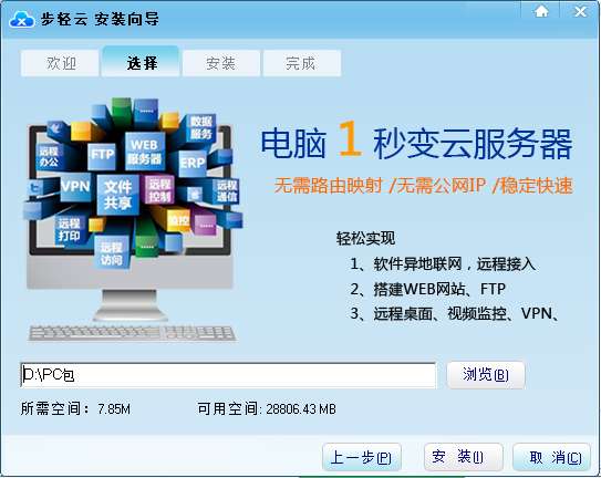 步轻云是一款免费的云服务器软件,它可以帮助用户把局域网的电脑或设备搬上云端,让不同区域的人通过互联网访问这台电脑中共享的内容。同时,它能将个人PC变成的服务器能够进行远程连接,非常稳定高效。步轻云软件使用简单、功能强大,能够自定义域名,能够即开即用,可以将电脑变成WEB /FTP /SQL等个人服务器。
