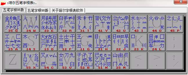培尔五笔字根表官方版是一款专业实用的五笔输入工具。培尔五笔字根表最新版具有QQ的自动窗口收缩功能,方便学习五笔字型及使用五笔字型打字的人员进行字根查询。培尔五笔字根表官方版软件包含五笔86、98两种字根表。可实现程序自启动功能。软件操作简单,打开软件界面中间就是字根表了。