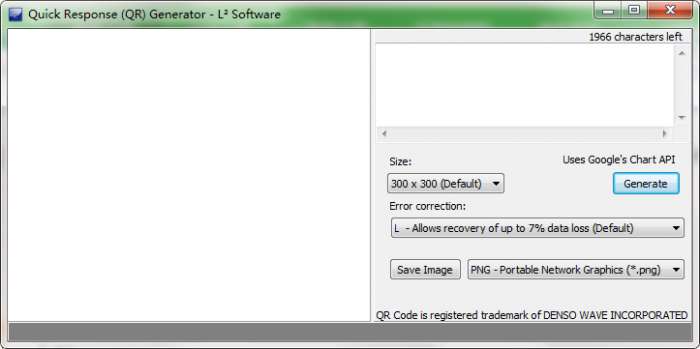 输入需要生成QR Code图的网址或是文字,size用于调整图片大小,error contection用于调整精细度,Generate用于生成QR Code图片,Save Image用于保存图片。