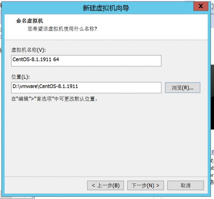 5、出现如下界面,输入自定义虚拟机名称,虚拟机名称最好能做到望文生义,这里是“CentOS-8.1.1911 64”,指定虚拟机位置,这里是“D:vmwareCentOS-8.1.1911”,然后下一步继续: