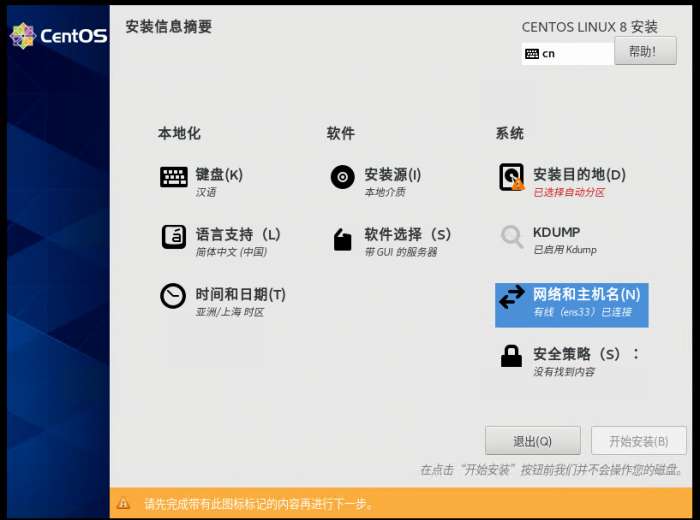 22、CentOS8安装配置主要界面如下图所示,根据界面展示,这里对以下3个部分配置进行说明: