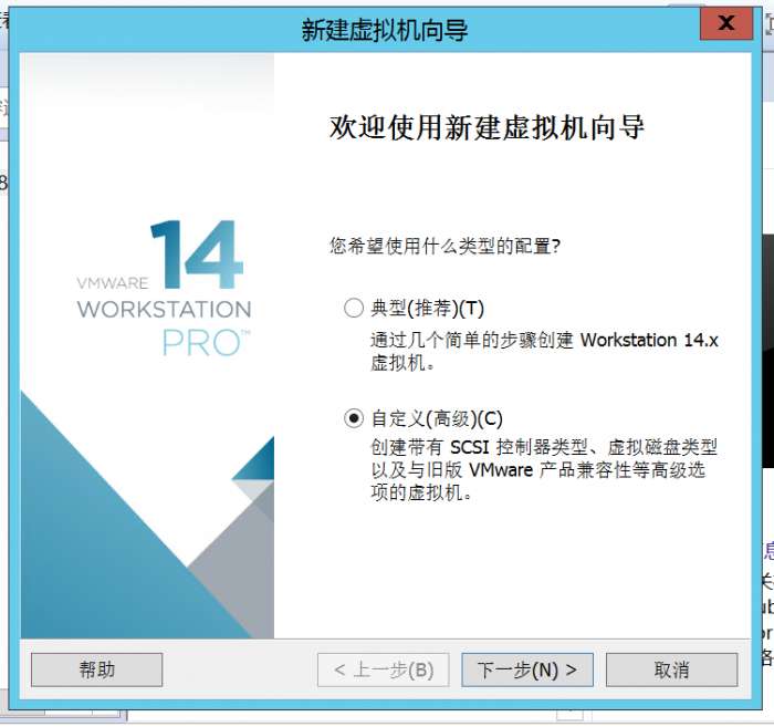 1、打开VMware,文件->新建虚拟机,出现如下界面,选择“自定义(高级)”选项,下一步继续: