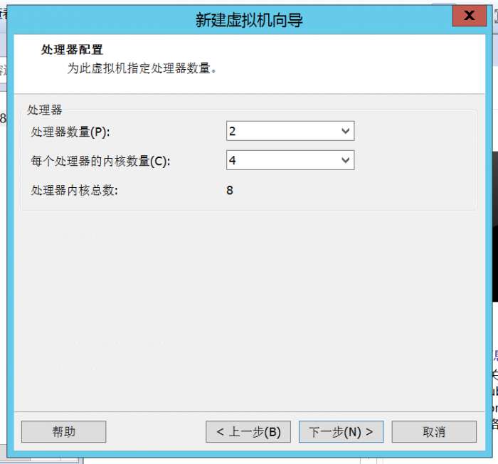 6、处理器配置页面,选择处理器数量和每个处理器核心数量,这里分别是2和4,下一步继续: