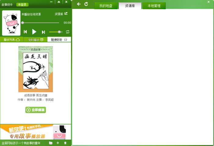 它是一款支持自动播放的故事播放器,本软件现在的宝贝一出生就被父母娇生惯养,连睡个觉也要父母给自己讲故事什么的,可是有哪个父母总会有时间来给孩子讲故事呢?故事奶牛一款给力的听故事软件,主要的针对6年级一下的孩子使用,包含了各种不同类型的故事,比如说:有声绘本、睡前故事、儿童小说、国学启蒙、诗歌散文、课文朗读、作文指导、英语听力等等,故事奶牛还支持本地资料上传进行收听,有兴趣的朋友不妨尝试一下吧!
