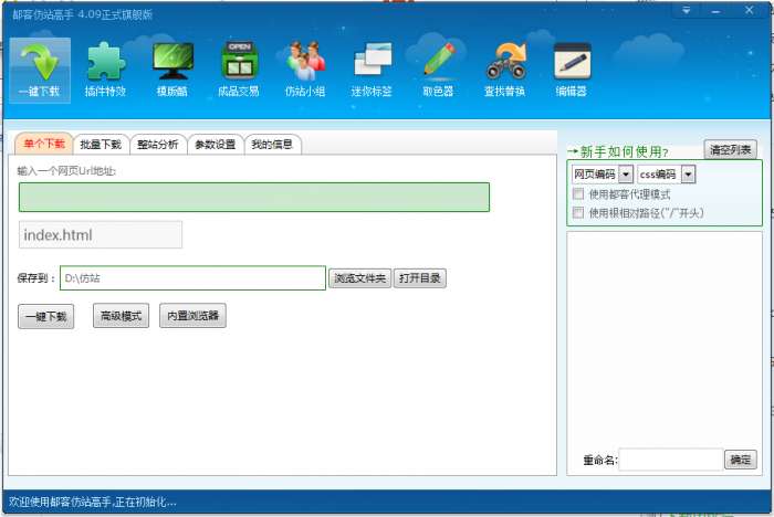 都客仿站高手官方版是一款适用于仿站人员使用的高效率的仿站软件。用户使用都客仿站高手最新版时只需要输入一个网址,就可完整进行网站扒皮,包括网站的图片、css、flash幻灯、js等资源全部下载归档。你不用担心是否精通css,是否修改网页后变形,因为页面全部交给都客仿站高手官方版处理,原来的是什么样子,我们得到的就是什么样子。