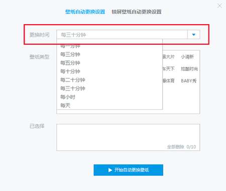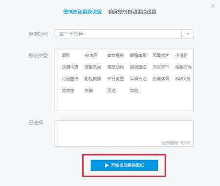 点击页面右上角设置图标,选择“自动更换”,点击“开始自动更换壁纸”即可