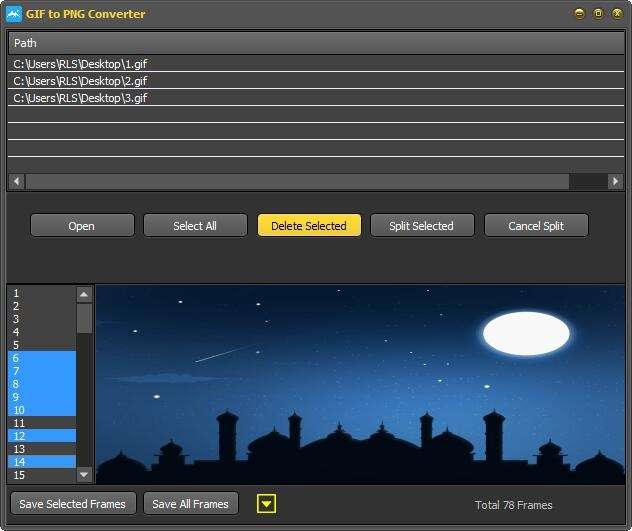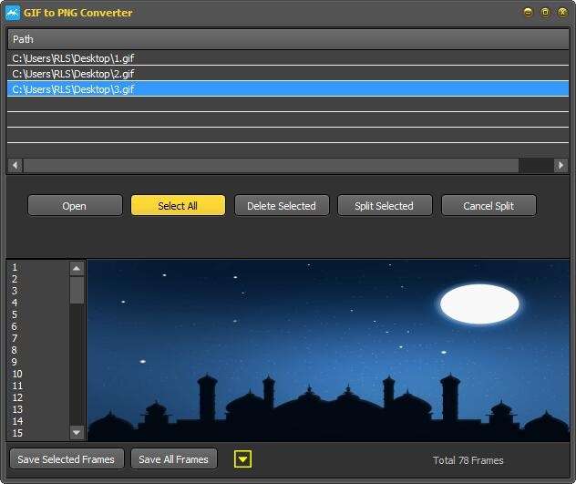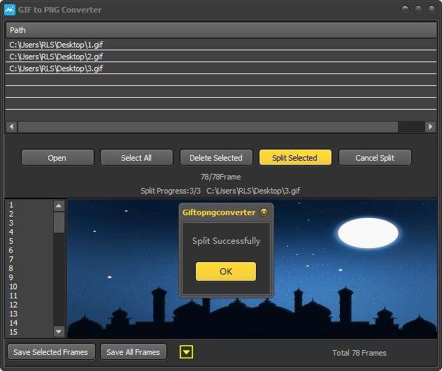 选择GIF文件,也可以单击“SelectAll”按钮,然后单击“SplitSelected”按钮,然后选择目录来保存PNG文件。
