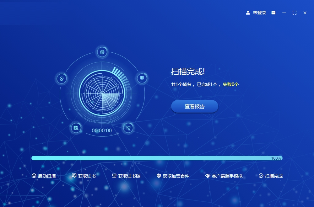 智能分析报告状态,支持双证书信息、多证书链、协议及加密套件信息、客户端握手模拟以及云端公网输出权威扫描报告的全面展示。