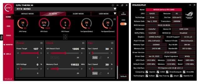 如果不把频率限制解除的话GPU核心的频率上限只有1060MHz,显存频率上限是5800MHz;在软件的Settings中的Tuning把图中这个“Overclocking range enhancement”选上后,软件会自动重启,解锁后GPU频率上限达到1820MHz,显存上限则是9999MHz。