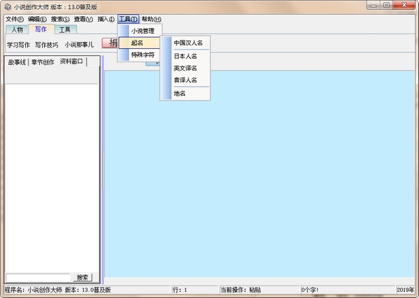 二、在工具位置,有一些小说常用工具,比如起名软件,特殊字符功能,小说管理功能。