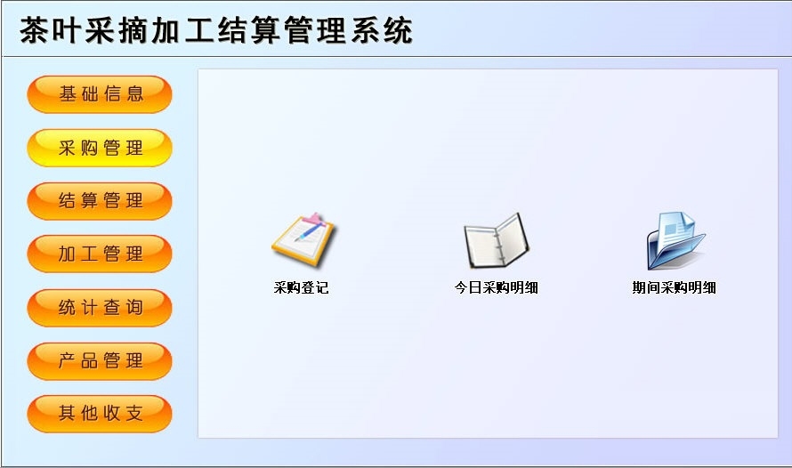 3、根据管理需要,你可选择进入基础信息、采购管理、结算管理、加工管理、统计查询、产品管理、其他收支等界面。