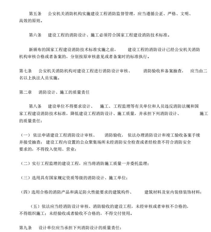 第三条 建设、设计、施工、工程监理等单位应当遵守消防法规、国家消防技术标准,对建设工程消防设计、施工质量和安全负责。