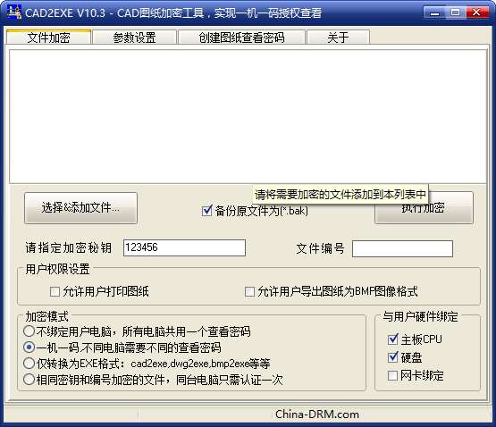 cad图纸加密工具cad2exe,加密您的图纸文件并可以一机一码授权分发,无需担心您的图纸文件被非法扩散!可以将各种图纸文件和图像文件转换为exe格式文件,可以设置是否需要查看密码才可以查看,可以设置查看密码是否与用户电脑硬件绑定,防止用户传播您的图纸文件;可以设置用户是否有权打印您的图纸;支持各种常见图纸和图像格式:autocad dwg & dxf, hpgl, svg 和 cgm 文件;无需安装autocad软件即可对图纸文件进行加密和直接浏览;