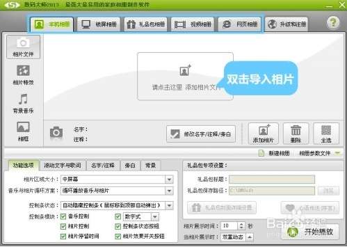 软件支持制作本机相册、锁屏相册、礼品包相册、视频相册、网页相册五大相册,你可以选择你需要制作的相册类型。如下图所示,双击软件中部,就可以将相片导入到相册内,然后就可以开始制作电子相册了(本文与制作本机相册为例子)。