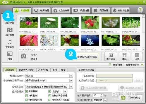 点击下图标签1-“相片文件”选项卡,我们可以看到刚才导入的相片。标签2-“修改名字/注释/旁白”按钮能够让我们每张相片添加名字、注释、旁白,如果相片数量多,还可以用ctrl键选中多张相片,进行批量修改~