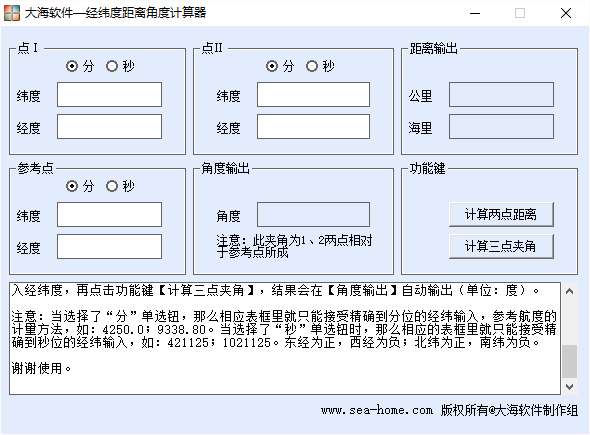 注意:当选择了“分”单选钮,那么相应表框里就只能接受精确到分位的经纬输入,参考航度的计量方法,如:4250.0;9338.80。当选择了“秒”单选钮时,那么相应的表框里就只能接受精确到秒位的经纬输入,如:421125;1021125。东经为正,西经为负;北纬为正,南纬为负。