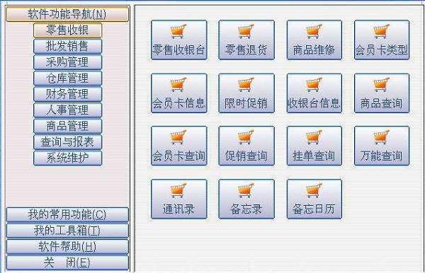 6.软件整合了零售收银、批发、采购、仓库、财务、人事、商品管理、查询与报表、系统维护等功能,协助您经营管理。
