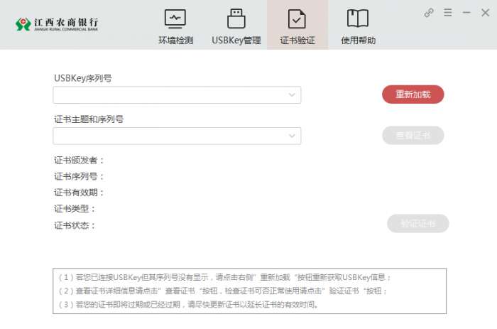 选择标题栏上的证书管理tab按钮进入证书管理页面,然后选择证书更新tab按钮进入证书更新页面,选择用户插入的USBKey ,选中需要进行验证的证书,点击证书验证按钮,在弹出的PIN码框中输入正确的PIN码,验证成功则证明用户的USBKey可以在网银系统中正常使用,否则可能USBKey中的证书遭到了破坏,请联系客服人员。