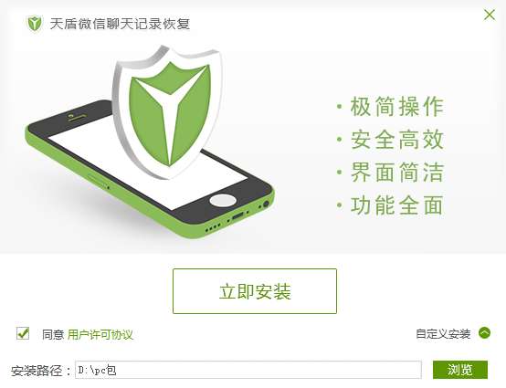 3.双击打开,进入微信聊天记录恢复软件界面,选择安装位置,阅读安装许可协议,点击我同意,立即安装