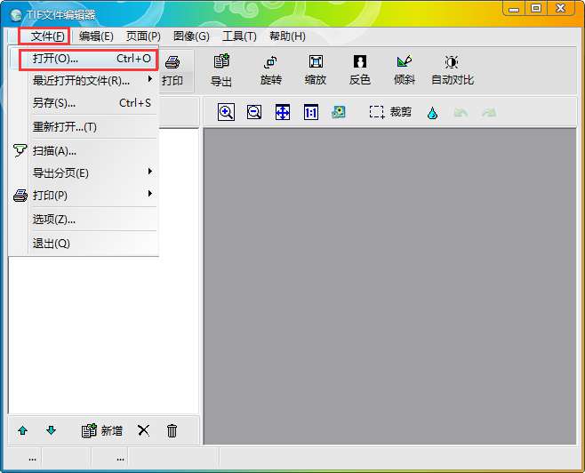 1、首先我们先打开TIF编辑器软件,进入到软件界面后,我们可以点击界面上方的“文件”选项,然后在下拉选项中我们可以看到有打开、另存、扫描、导出分页、打印等选项,我们可以点击打开选项将需要编辑的TIF文件添加进来。