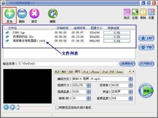 转换输出视频格式 3GP、3G2、MP4、H.264/MPEG-4 AVC、MPEG、FLV、VOB、MOV、WMV、ASF 等格式