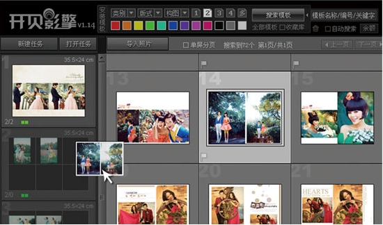 开贝影擎搭载强大的模板搜索引擎,用户可以根据照片类型、输出尺寸、照片分组张数、颜色风格等属性搜索合适的模板,支持模板拖入照片分组、批量自动匹配模板功能。