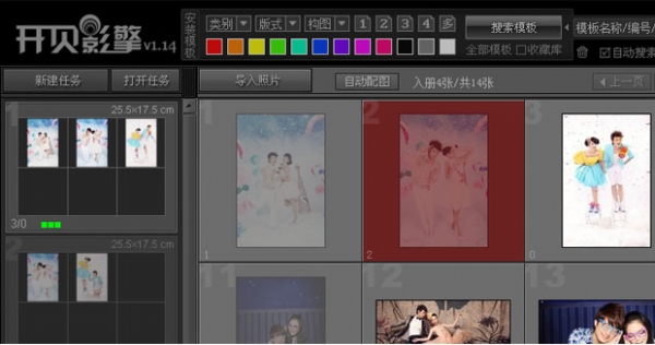 开贝影擎采用先进的照片防漏统计技术,实时监测照片使用情况,让照片的漏做、重做现象不再发生。包括未入册照片突出显示、重复入册照片突出显示、入册照片数实时统计、已使用模板突出显示。
