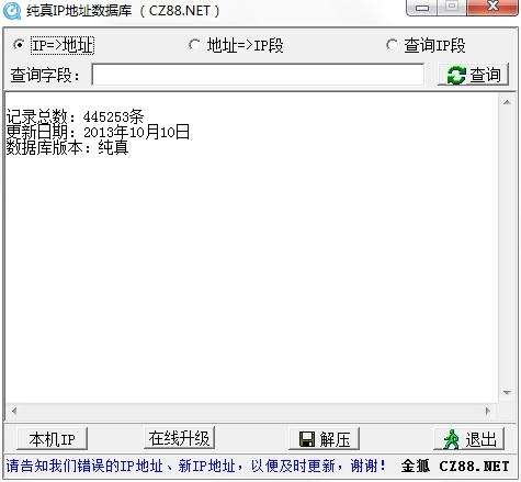 随数据库附送的查询程序(Showip.exe)具有在线检测并升级IP数据库的功能,只要运行该程序,点击右上角的“在线升级”,就可以升级IP数据库到最新的版本,无需再到下载网站下载新版的IP数据库。