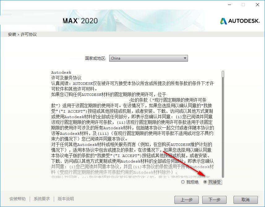 3、显示安装的协议内容,这里是官方的协议,点击接受