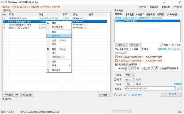 您导入音乐、设置视频素材目录,设置诸项参数,即可一键批量生成音乐MV视频,您还可合成图片与歌曲生成MV视频。