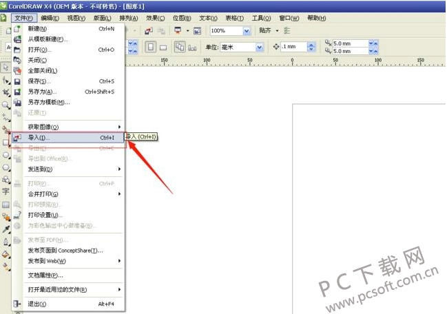 1.点击CorelDraw X4主界面左上角的【文件】,在弹出的选项中选择【导入】,然后选择需要制作的图片(cdr导入图片的时候需要在界面中按住鼠标左键的同时托拖动鼠标,设置图片的大小);