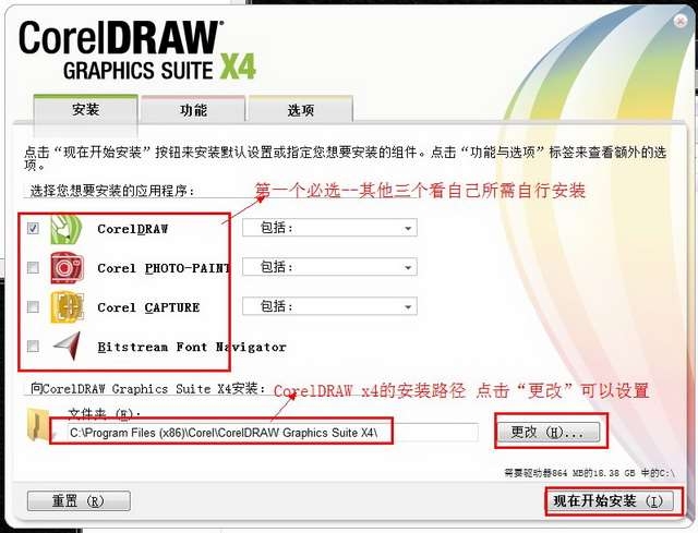 4、选择coreldrawx4安装模块,您可以自行选择。然后点击【更改】选择coreldrawx4的安装位置,选择完成后点击【现在开始安装】。
