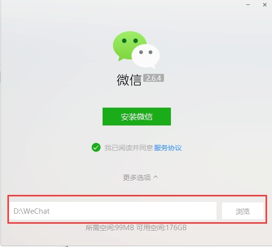 2、进入到微信电脑版安装界面后,用户可以直接点击安装微信,将软件默认安装到C盘或者点击下方的更多选项,将软件安装到其他位置。(小编建议用户选择自定义安装,将软件安装到其他盘中)