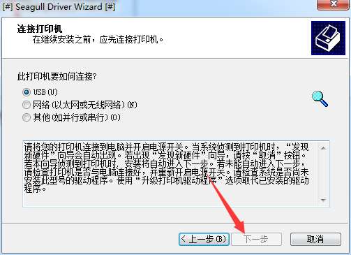 3、打开打印机电源,待搜索到设备后,点击【下一步】;