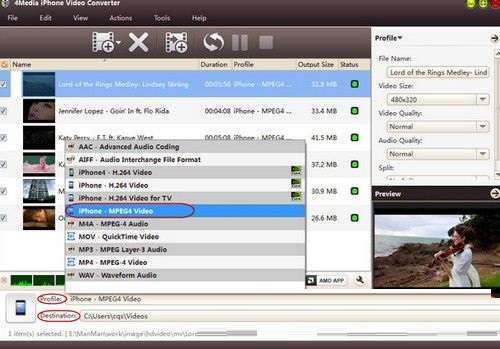 4Media iPhone Video Converter支持将AVI,MPEG,WMV,MOV,MP4,RM,RMVB,DivX,ASF,VOB,3GP等所有流行视频转换为iPhone MP4视频。