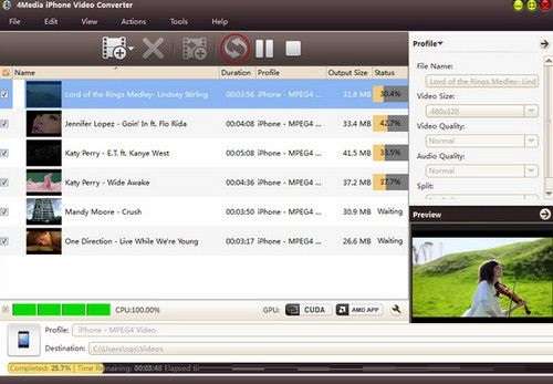 要随时在iPhone上观看任何视频,4Media iPhone Video Converter可帮助您将所有流行的视频格式(例如MPEG,WMV,MOV,MP4,RM,RMVB,DivX,ASF,VOB,3GP和AVI)转换为iPhone视频MP4和Quick Time MOV 。作为iPhone音乐转换器,它还可以将WMA,MP2,OGG,RA,AC3,APE和CDA格式的那些视频和流行音乐文件转换为MP3,WAV,AAC和AIFF格式的iPhone音乐,并解码CD光盘和将CD曲目也转换为iPhone音频。
