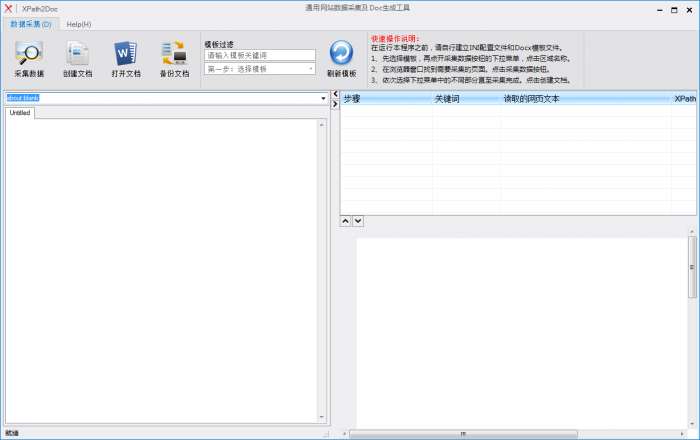 XPath2Doc是一款可以帮助用户在网页上收集数据并且填写doc文件的软件,这款软件使用简单,软件界面没有太多功能,用户点击采集就可以开始查询网页上的数据,从而执行填充,对于需要编辑doc文件的朋友很有帮助,您可以在软件添加需要编辑的doc文件,可以在软件配置需要填充以及需要采集网站数据的的规则,结合XPath语句就可以获取您需要采集的网页内容,软件提供详细的操作桌面,用户可以在帮助界面查看教程!
